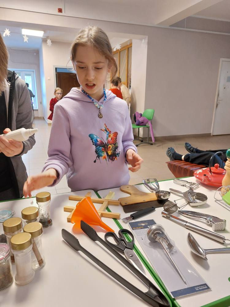 Ar lielu interesi skolēni zvejoja zivis no bļodas, sita naglu un minēja dažādus koka apstrādei izmantojamos darba rīkus. Tāpat bērni iepazina virtuvē izmantojamos darba rīkus un garšvielas, paplašinot vārdu krājumu un izpratni par ikdienas sadzīvi. Muzikālajā daļā skolēni minēja un izmēģināja dažādus instrumentus, ieklausoties skaņās un mācoties tās atšķirt.